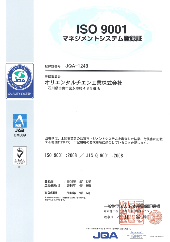 世界中どこでも適用されるのは認証工場だからです。創業以来、オリエンタルチエン工業が不変のモットーとしているのは、高品質と価値ある製品づくり。時代と社会の多様な要請に応え、当社製品および生産技術、製造設備の優秀性は、国内はもとより海外でも高い評価を受けています。本社ローラチェーン工場が品質保証の国際規格〈ISO9001〉の認証を取得したことは、「お客様の立場にたった品質保証を行っているメーカー」であることを国内外に広く証明するものです。〈ISO9001〉の認証取得により、当社製品は世界中どこでも安心してご使用いただけるのはもちろん、お客様が機械等を海外へ輸出する場合にも、認証工場で生産した部品を使用していることで、信頼と評価が高まりきわめて有利です。マニュアルを文書化、品質記録も整備されているため、製造物責任予防(PLP)効果や製造物責任(PL)訴訟においても有利になるといわれます。また、お客様ご自身による工場審査が省略できるため、相互の無駄を軽減できるというのも大きなメリットです。品質保証の国際規格〈ISO9001〉の登録認定を受けた機械メーカーのひとつとして、オリエンタルチエン工業は今後とも品質保証体制の維持・改善に努め、多様な先進ニーズに応えた製品・技術・サービスをご提供してまいります。