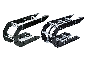 ケーブルチェーンとは工作機械をはじめとする産業機械において、可動部のケーブル配線をまとめ、保護・案内する装置です。チェーン本体のサポータやバーに電線や油圧ホース等を通すことでケーブルやホース同士が絡まったり、擦れ合ったりすることなく確実に案内できます。