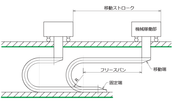 | 右図はケーブルチェーンの一般的な使用方法の作動原理です。チェーンの一端は機械可動部に取付けられており、他端はチェーンレールなどに固定されています。ケーブルチェーンは常に一定の屈曲半径を保ちながら機械可動部に追従しています。チェーンに支持されたケーブルやホースは固定端から移動端を通り、機械可動部へケーブルやホースを通して電気・液体などを供給することができます。 |