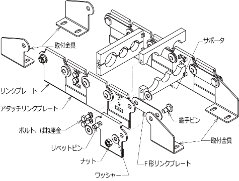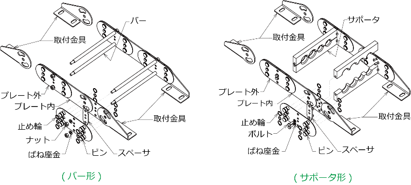 N-KCS 形ケーブルチェーンは、屈曲部での開口部がなく取扱い上で安全であると同時にプレートやピンに熱処理が施されているので、耐荷重・耐摩耗性に優れています。ケーブルやホース支持部はサポータ形または、バー形の2種類があります。リンク数は奇数リンクを標準としますが、偶数リンクでの製作も可能です。