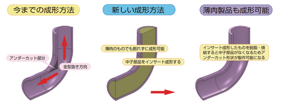 | 配管部品のような場合、通常成形ではアンダーカットとなる部分が発生し問題となるケースが多少ありますが、当社独自の中空MIM製法では特殊な中子を利用し、アンダーカット部の問題も気にせず製作が可能となります。Y字配管形状等もお任せください。 |