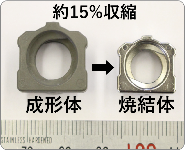 金属粉を焼結させる。鋼種により異なるが 1200℃以上で数時間行う。焼結後の製品は成形時に比べおおよそ 15% 前後収縮します。