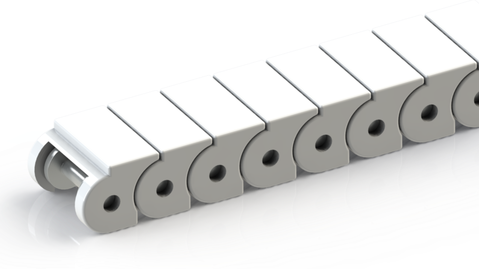 CT クリップトップチェーンピン部を延長した特殊チェーンに樹脂カバーを被せ、フラットな上面で製品搬送を可能にするチェーンです。樹脂カバーの形状よりスプロケット部などの屈曲時でも開口がなく、ごみなどの異物を噛み込みにくくなっています。樹脂チェーンの選定では強度不足だが製品に出来るだけ傷を付けたくない場合に適したチェーンです。 |