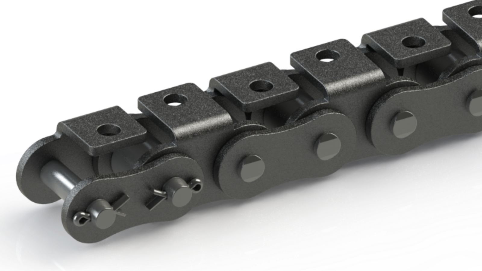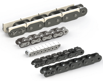 内曲げアタッチメントローラチェーン標準 A-1 アタッチメントをチェーン内側へ向けて組付けたチェーンです。アタッチ穴の無い A-0 仕様でも製作できます。標準仕様はアタッチの向きを千鳥状に組付けますが、片側のみに組み付けることもできます。スプロケットは、ローラチェーン用標準スプロケットが使用できます。 |