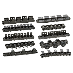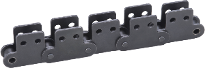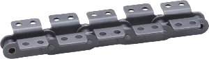 OCM 標準コンベヤチェーン (FM・FE 形 ) は、数多くの工場やさまざまな条件で使用されていますが、軽量品の運搬には標準コンベヤチェーン (FM・FE 形 ) では、サイズが大きすぎたり、精度の点で使用できない場合があります。このような場合の軽量品の運搬には、小形コンベヤチェーンを使用すれば最適です。また輸送物の形状やサイズにより種々のアタッチメントが考えられますが、最も一般的に使用されるタイプのダブルピッチチェーンやアタッチメント付きローラチェーンには標準アタッチメント付きチェーンを用意しています。