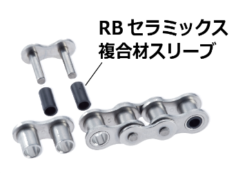 SUS-RB ステンレスチェーンは、ピンとブシュの間に RB セラミックスの複合材スリーブを組み合わせることで従来のステンレスチェーンと比較して摩耗寿命が 10 倍以上になりました。標準タイプはローラのないブシュドタイプとなりますが、ダブルピッチチェーンにて大径ローラをご指定頂ければローラタイプとなり、最も効力を発揮します。大径ローラの材質はステンレス製と樹脂製の2種類です。