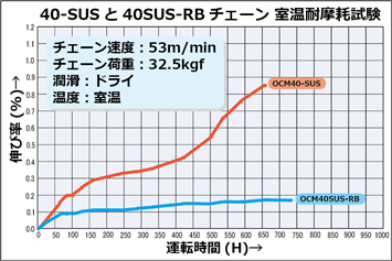 汎用ステンレスチェーンと比較してSUS-RBは750時間経過時点でも殆ど伸びが発生しておりません。